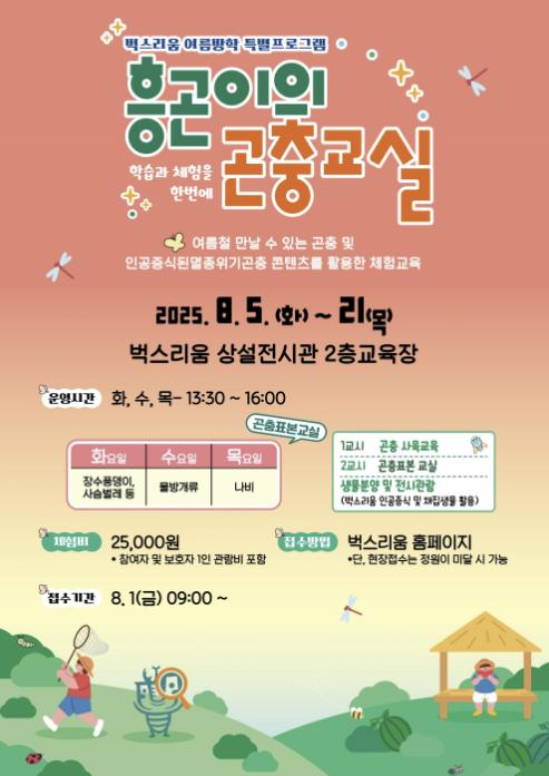 이번 프로그램은 벅스리움 상설전시관 2층 교육장에서 진행되며 여름철에 만날 수 있는 다양한 곤충의 생태와 사육 방법을 배우고 직접 체험할 수 있도록 구성됐다. 초등학교 정규 교과과정과 연계해 학습 효과를 높였으며, 여름방학 기간 아이들에게 유익한 자연 학습의 기회를 제공할 예정이다.