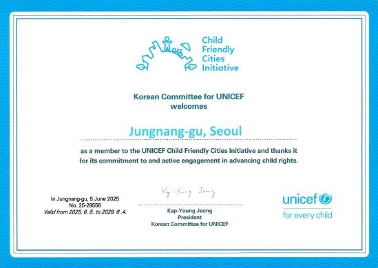 류경기 중랑구청장은 “이번 유니세프 아동친화도시 인증은 구민과 함께 만들어낸 값진 성과”라며, “모든 세대가 함께 자라고, 함께 돌보고, 함께 웃을 수 있는 도시를 만들어가겠다”라고 말했다.