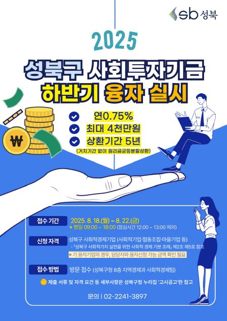 성북구 사회투자기금 융자 사업은 상‧하반기로 나뉘어 진행되며, 성북구 내 사회적경제기업이라면 연 0.75%의 금리로 거치기간 없이 최대 5년간 원리금균등분할상환 조건으로 융자를 받을 수 있다. 기업당 최대 4,000만원까지 신청 가능하다.