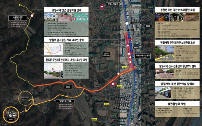 내년 상반기까지 망월사역 인근 호암로의 보도를 확장하는 등 쾌적한 보행환경을 조성하고, 망월사역에서 원도봉산 유원지 방향에 대한 '망월로 걷고 싶은 거리 디자인 개발용역'을 완료할 예정이다.