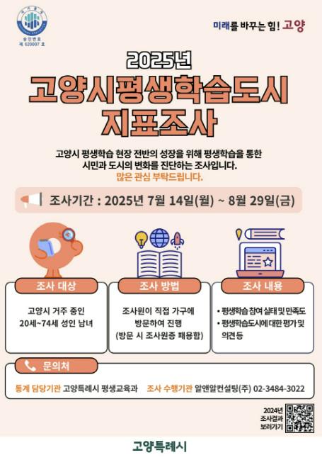 조사 결과는 올해 12월 중 고양시청 누리집, 고양시 평생학습포털, 국가통계포털(KOSIS) 등에 공개될 예정이다.