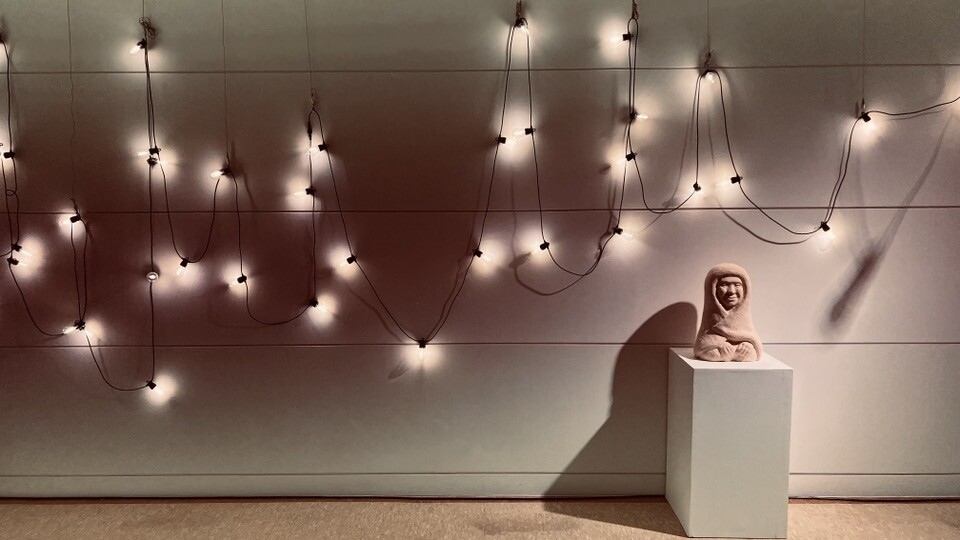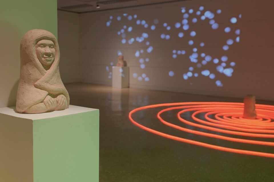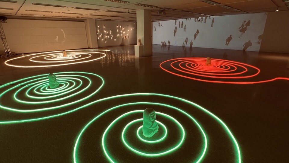 전시장에는 흙으로 빚어내어 가마에서 초벌 한 테라코타 나한상이 놓여 있으며 줄로 된 네온 조명이 회오리를 치듯 퍼져나가고 있는 모습이다. 큰 벽면 전체에 영상을 비추고 있는데 사람들이 이리저리 걸어가는 장면이 나온다. 사람들의 말소리와 섞여 들리는 발자국 소리는 심장 소리처럼 두근거린다.