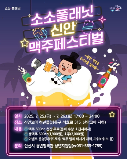 이번 맥주페스티벌은 소소플래닛 신안 청년상인들이 지역 주민과의 상생협력을 위해 마련한 고객 감사 행사로, 시민들에게 저렴한 먹거리와 열린 쉼터 공간 등을 제공한다.