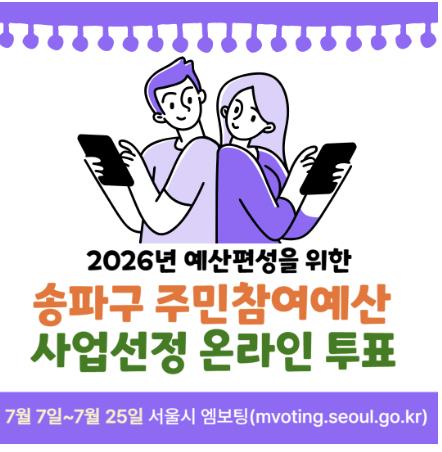 서강석 송파구청장은 “실제 체감하실 수 있는 사업들이 내년도 예산에 반영되도록 적극적으로 투표에 참여해 주시길 바란다”라며, “앞으로도 주권자이신 구민의 목소리를 구정에 담기 위해 창의와 혁신, 공정의 자세로 최선을 다할 것”이라고 전했다.