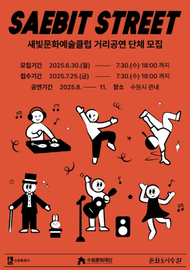 코로나 이후 침체되어 있는 지역의 문화예술 동아리들이 갈고닦은 예술적 역량을 발휘할 수 있는 기회를 제공하며 2인 이상 음악, 춤, 다원공연, 마술 등 거리공연이 가능한 단체를 모집하며 재단은 음향장비 및 공연 홍보 등을 지원할 예정이며 2025년 7월 25일부터 30일까지 문화도시 수원 홈페이지를 통해 활동계획서 등을 접수 받는다.