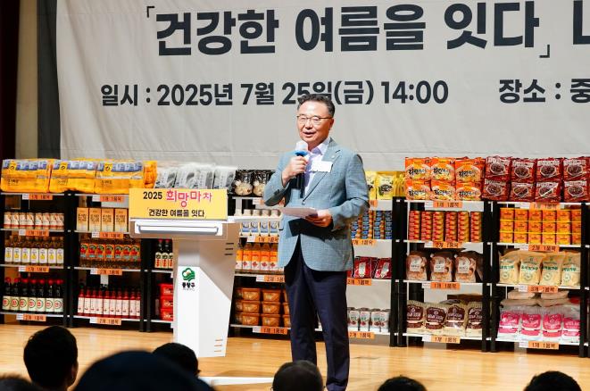 행사는 이마트 문화공연팀의 식전 공연으로 시작해 내빈 인사말씀과 기념촬영, 본격적인 나눔 행사로 이어졌다. 참여 주민들은 진열된 품목 중 원하는 식품 5가지를 직접 선택해 담고, 여름철 보양식(즉석 삼계탕)을 함께 전달받았다.