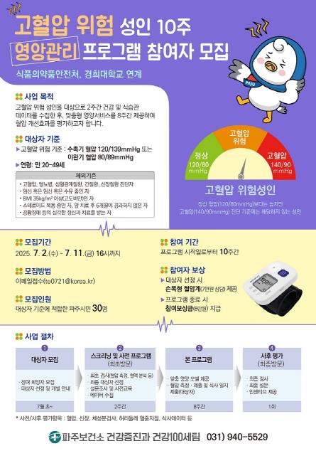 '고혈압 위험 성인 10주 영양관리 프로그램'은 고혈압 위험 성인을 대상으로 2주간 건강 및 식습관 자료를 수집한 후, 맞춤형 영양서비스를 8주간 제공하여 혈압 개선 효과를 평가하고자 식품의약품안전처와 경희대학교와 협력하여 진행하는 사업이다.