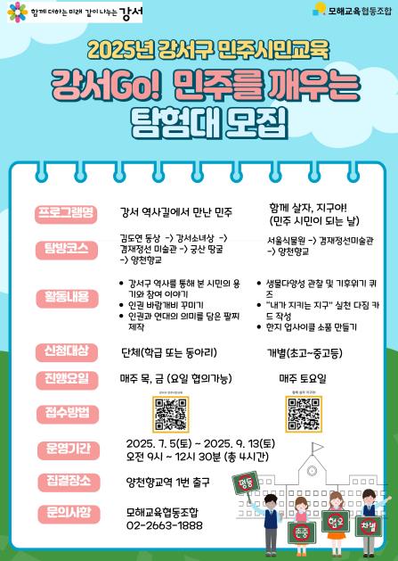 먼저, ‘강서 역사길에서 만난 민주’프로그램은 7월 10일부터 9월 12일까지 매주 목요일과 금요일에 운영된다. 오전 9시부터 오후 12시 30분까지 진행되며, 초등학교 고학년 학급 또는 동아리 10명 이상을 대상으로 한다.