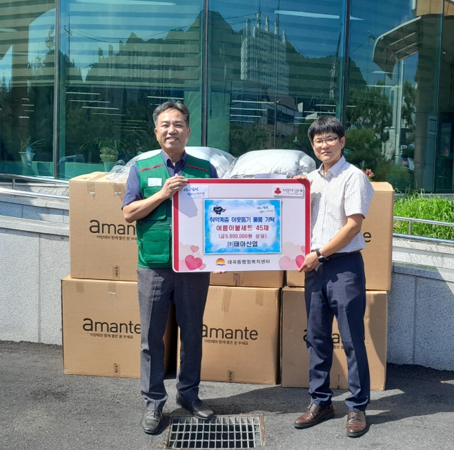 강진규 대곡동장은 “어려운 시기에도 이웃을 위한 나눔을 실천해 주신 ㈜태아산업 임직원 여러분께 깊은 감사를 드린다.”라며, “소중한 물품은 도움이 필요한 가정에 잘 전달하겠다.”라고 전했다.