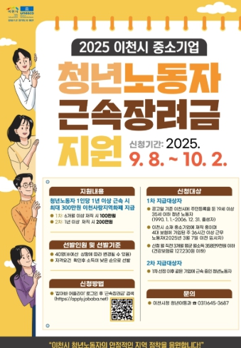 이 사업은 청년들의 중소기업 장기근속을 유도해 안정적인 지역 정착을 돕고 중소기업 청년 고용난을 해소하기 위한 이천시 청년정책의 하나이다. 신청 자격은 ▲이천시에 거주하는 19세 이상 35세 이하 청년(1990.1.1.~2006.12.31. 출생자) ▲관내 중소기업 재직자로 4대 보험 가입 및 주 36시간 이상 근무 노동자 ▲2025년 6월부터 2025년 8월까지 3개월 평균 월 소득 358만 9천 원 이하(건강보험료 12만 7,230원 이하)의 요건을 갖추어야 한다.