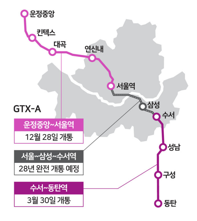 올 연말 파주 운정중앙역부터 서울역까지 GTX 운행이 개시되면, 일반 전철로는 1시간 이상, 광역버스로는 약 90분가량 걸리던 이동시간이 22분으로 단축될 전망이다. 복합환승센터 조성으로 개통이 미뤄지고 있는 삼성역이 문을 여는 2028년부터는 강남 한복판까지 30분 이내 접근이 가능해지고, 종점역인 동탄역까지 82.1km 전 구간을 달려도 약 50분 가량 소요될 것으로 예상된다.