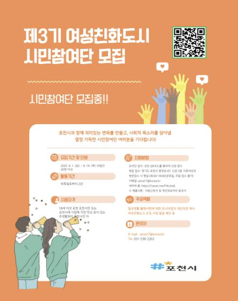 모집 대상은 18세 이상의 포천시민 또는 포천시에서 거주하거나 생활권을 두고 있는 사람으로, 성평등 정책과 지역사회 활동에 관심이 있다면 누구나 지원할 수 있다. 신청은 네이버폼 또는 포스터에 기재된 정보무늬(QR코드)로 할 수 있으며, 자세한 내용은 포천시청 누리집에서 확인할 수 있다.