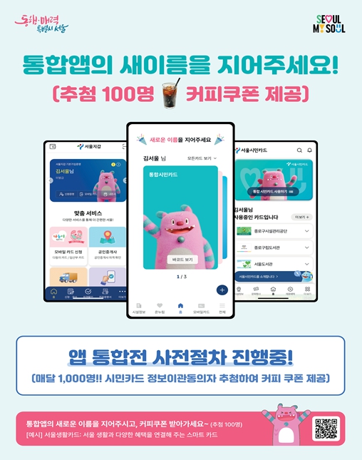 한편 7월 9일~25일까지 서울시 엠보팅을 통해 통합 앱 명칭 공모도 진행한다. 시는 추첨을 통해 우수제안자 100명에게 커피 쿠폰을 제공할 예정이다.