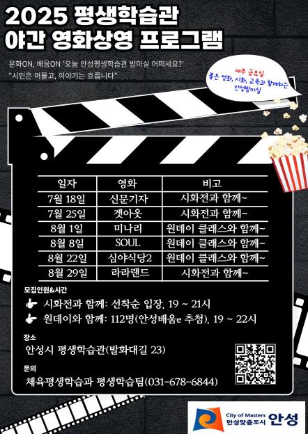 이번 하절기 야간 영화 상영 프로그램은 아카데미 수상작 및 평생학습관에서 운영 중인 평생학습 프로그램과 주제가 연계된 영화를 중심으로 구성되며, 단순한 영화 관람을 넘어 시화전, 제2기 원데이 클래스 등 다양한 교육 프로그램과 연계하여 운영될 예정이다.