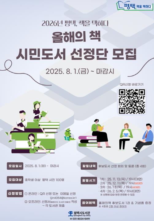 ‘올해의 책’은 추천된 후보 도서 중 시민도서선정단 토론을 거쳐 연령별 올해의 책 3권과 함께 읽는 책 10권을 선정하며, 아래의 도서 선정 기준을 충족한 책이면 추천이 가능하다. 8월 한 달간 온/오프라인을 활용한 정보무늬(QR)나 도서관 방문 신청으로 평택시민 누구나 추천할 수 있다.