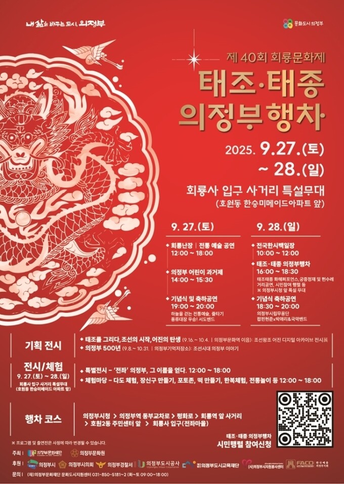 ‘태조·태종 의정부행차’는 28일 의정부예술의전당과 예총에서 출발해 의정부역 동부교차로, 호원2동 주민센터를 거쳐 전좌마을 특설무대까지 약 4.5km 구간에서 진행된다. 이번 행사는 의정부가 군사도시 이미지를 넘어 역사문화의 가치를 재조명하고, 시민 참여형 역사 축제로서 지역의 새로운 브랜드를 만들어가는 중요한 계기가 될 것으로 평가받고 있다.