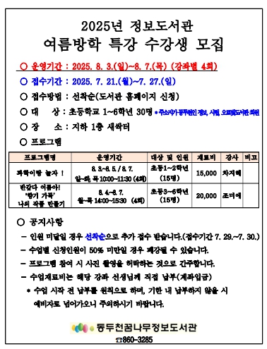 방학 특강은 8월 3일부터 7일까지 진행되며, 동두천시 도서관 홈페이지를 통해 선착순으로 접수할 수 있다.