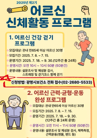 나기효 건강위생과장은 “이번 프로그램이 어르신이 일상에서 건강한 생활습관을 실천하고 비만을 예방하는 데 도움이 되길 바란다”며 “다양한 신체활동 프로그램을 제공해 시민의 건강한 삶을 지원하겠다”고 말했다.