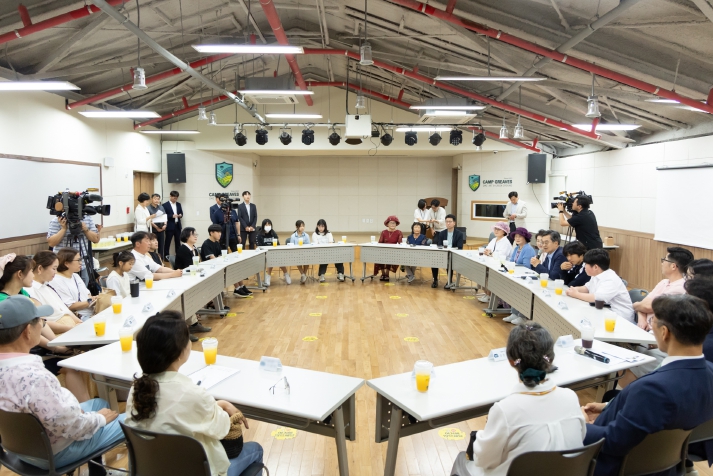 김동연 지사는 9일 파주시 캠프그리브스 DMZ체험관에서 대성동 마을 주민 차담회를 갖고 “제가 첫 번째, 두 번째 뵀을 때보다 오늘은 다들 얼굴에 활기가 돌고 웃음꽃을 피운 것 같아서 너무 기분이 좋다”며 “그 때 방음창 설치, 의료지원, 임시숙소 마련 등 세 가지 약속을 드렸는데 신속하게 진행돼 (어르신들이) 아주 좋은 얘기를 많이 해주셨다”고 말했다.