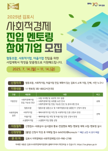 모집 대상은 사회적경제기업 진입을 계획 중인 김포시 소재 기업, 단체, 시민 등이며, 특히 사회적기업 인증 후 공공시장 진입 계획이 있을 경우 우선 선정할 계획이다.