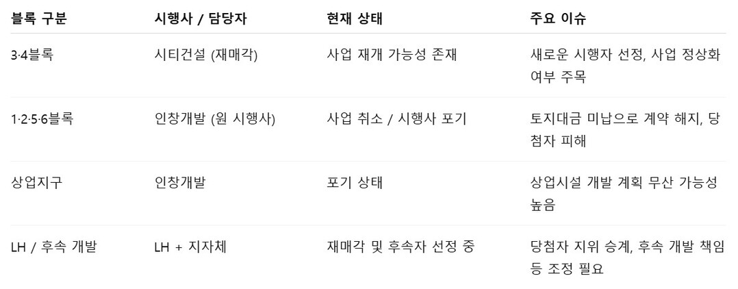 일부 구역은 재매각을 통해 새로운 시행자가 선정됐다. 3·4블록의 경우 시티건설이 새로 사업을 맡아 재추진 가능성이 열렸지만, 1·2·5·6블록과 상업지구는 여전히 사업 중단 상태다. 후속 시행자 선정, 설계 변경, 인허가 절차 재개 등 현실적인 난관이 산적해 있어 사업 정상화까지는 상당한 시간이 필요할 것으로 보인다.
