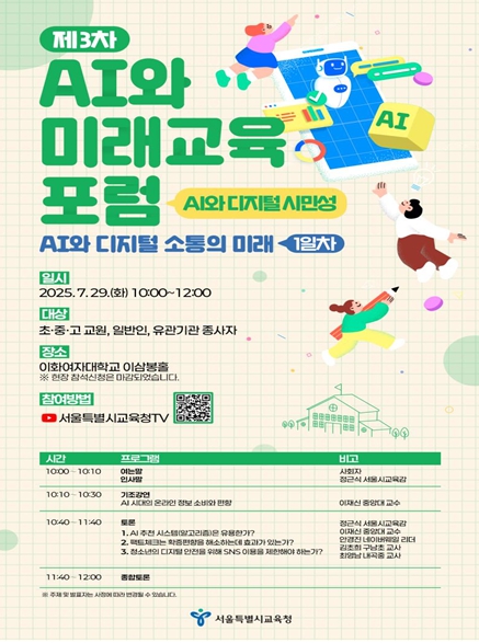 이번 포럼은 1일차 'AI와 디지털 소통의 미래', 2일차 'AI 시대의 디지털 시민성 교육'을 주제로 구성되며, 초·중·고 교원, 교육전문직원, 일반시민, 유관기관 종사자 등 120명 내외가 참여할 예정이며, 참여를 희망하는 시민들은 서울시교육청 공식 유튜브 채널인 '서울시교육청TV'를 통해 실시간으로 참여할 수 있다.