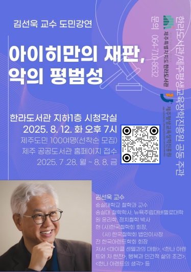 강연은 12일 오후 7시부터 9시까지 한라도서관 시청각실에서 진행되며, 도민 누구나 무료로 참여할 수 있다. 신청은 8일까지 한라도서관 누리집(홈페이지)을 통해 선착순으로 접수받는다.