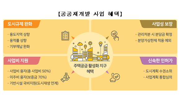 그동안 민간 재개발사업에서 문제가 됐던 둥지내몰림도 최소화한다. 이를 위해 LH는 지분형주택 등 맞춤형 공급방식과 다양한 이주대책(이주비융자, 임대주택 등)을 통해 기존 원주민이 개발 후 원활히 재정착 할 수 있도록 지원할 방침이다.