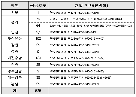 공급 대상 모두 전용면적 59㎡이하의 주택이며, 지역별로는 수도권 171호, 부산·울산·경남 127호, 대구·경북 35호, 대전·충남·충북 129호, 광주·전남·전북 38호, 강원 25호 등 총 525호를 공급한다.