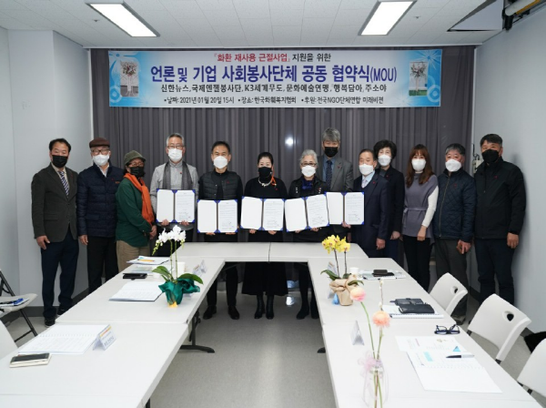 '화환재사용근절사업'의 공동협약식에는 한국화훼복지협회 회장 노은순, 신한뉴스 대표 고태우, 국제엔젤봉사단 대표 최수현, K3세계무도문화예술연맹 양승근 대표, 행복담아주소야 주윤경 대표가 공동협약식에 서명했다.