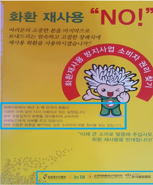 법적규정에는 생화를 재사용해 만든 화환을 판매할 때는 반드시 재사용 화환임을 표시해 소비자에게 알리도록 한 '재사용 화환 표시제'를 규정하고 있다.