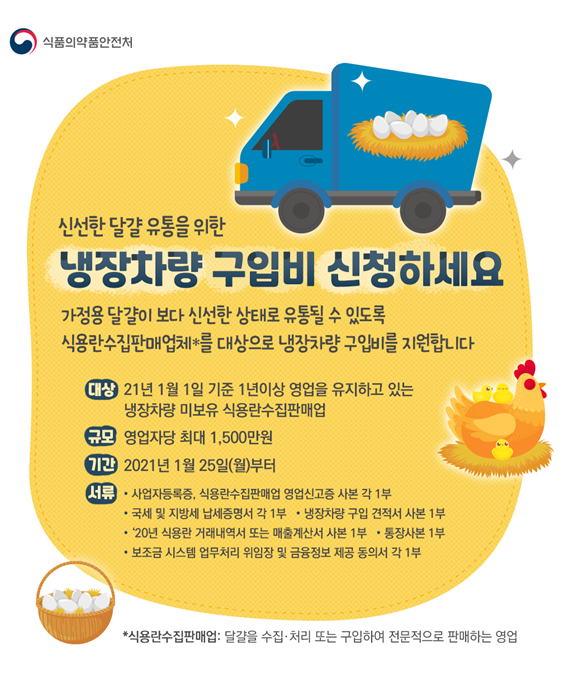 냉장차량 구입비 지원 대상은 1년 이상 영업(2021년 1월 1일 기준)을 유지하면서 냉장차량을 미보유한 식용란수집판매업 250곳이며, 영업자당 최대 1,500만원을 지원한다.