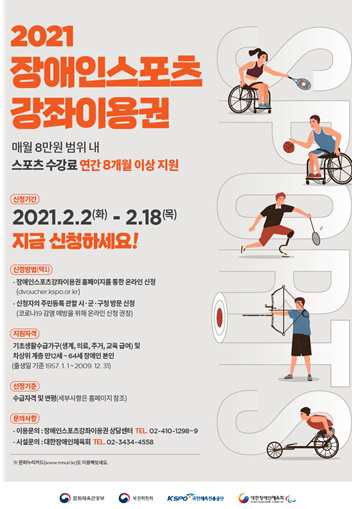 국민체육진흥공단은 2월 2일부터 18일까지 장애인스포츠강좌이용권 대상자 신청을 받는다. 코로나19 확산 방지를 위해 누리집을 통한 비대면 신청을 중심으로 운영할 계획이라고 말했다.