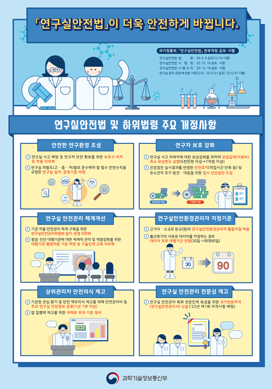 과기정통부는 연구실사고 예방과 연구현장에서의 실질적인 연구자 보호 강화를 위해 최근 개정․시행(2020.12월)한「연구실 안전환경 조성에 관한 법률」과 하위법령, 「연구실 설치 운영에 관한 기준(고시)」(제정 2020.12.31., 시행 2023.1.1.) 등이 실효성을 가질 수 있도록 연구현장과의 소통에 노력하고 있다.