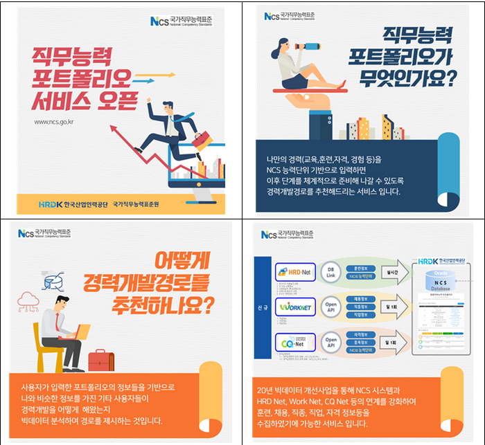 “직무능력기반 개인별 경력개발 추천서비스”는 개인이 이수한 교육.훈련.자격.경험 혹은 경력사항을 입력해 포트폴리오를 완성하면, 국가직무능력표준(NCS) 빅데이터 분석을 통해 직무중심 경력개발경로를 추천해주는 서비스다.