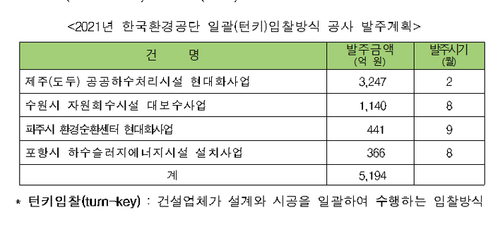한국환경공단은 제주(도두) 공공하수처리시설 현대화사업을 비롯한 총 4건(5,194억 원)을 일괄(턴키)입찰방식으로 진행된다.