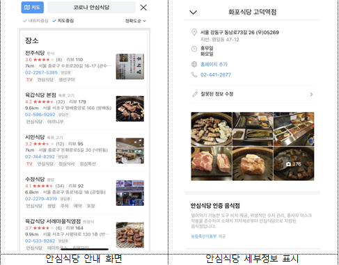 카카오맵 또는 다음 검색 창에서 ‘안심식당’ 또는 ‘코로나 안심식당’으로 검색 시 지자체로부터 안심식당으로 지정된 음식점들의 위치를 확인할 수 있다.