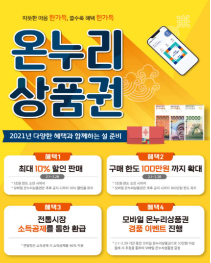 2019년 출시된 모바일 온누리상품권은 판매 활성화를 위해 2021년은 12월까지 1년 내내 할인율 10%, 월 구매한도 100만원(기존 70만원)을 적용해 판매한다.