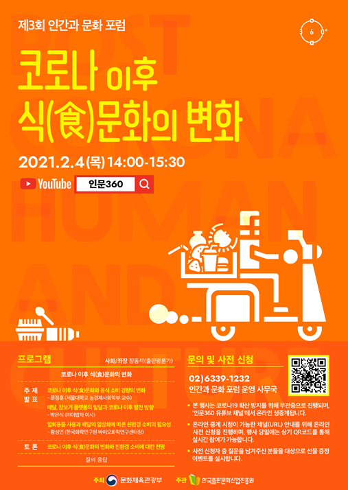 이번 토론회에서는 코로나19 이후 배달과 온라인 장보기 등 음식 소비의 변화, 이에 따른 일회용품 사용 증가 등 식(食)문화의 변화를 다룬다. 파주출판도시문화재단 장동석 문화사업본부장이 사회를 맡고 문정훈 서울대학교 농경제사회학부 교수가 ‘코로나 이후 식(食)문화와 음식 소비 경향의 변화’를 주제로 발표한다.