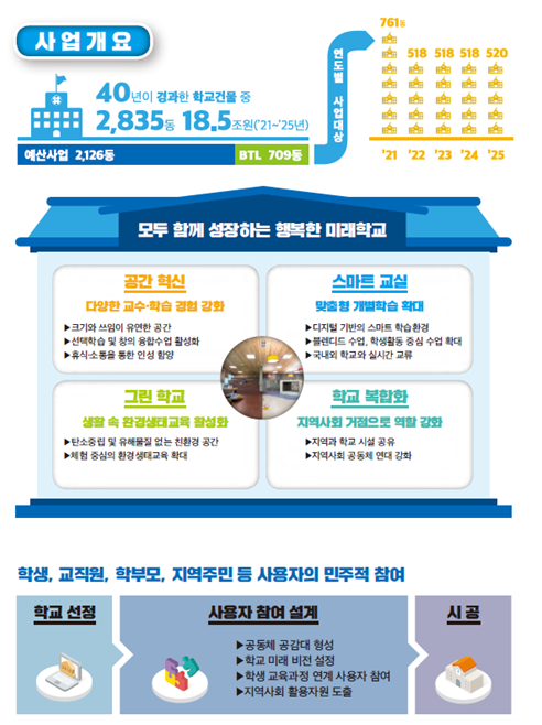 그린스마트 미래학교 사업은 40년 이상 경과한 학교 건물 2,835동을 대상으로 2025년까지 총 사업비 18.5조원*이 투입된다.