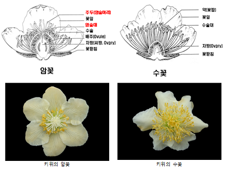 키위나무의 암수 구별은 잎이나 가지 모양으로는 구별이 어렵고 꽃 기관의 생김새로 확인해야 한다.
