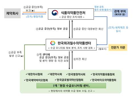 참고로 제조‧수입‧유통‧사용 등 현장에서의 의약품 수급 상황을 모니터링하기 위해 2017년부터 약사회·의사협회·제약협회 등 7개 전문단체에 ‘현장 수급모니터링 센터’를 설치·운영하고 있으며 ‘한국희귀필수의약품센터’가 운영을 지원하고 있다.