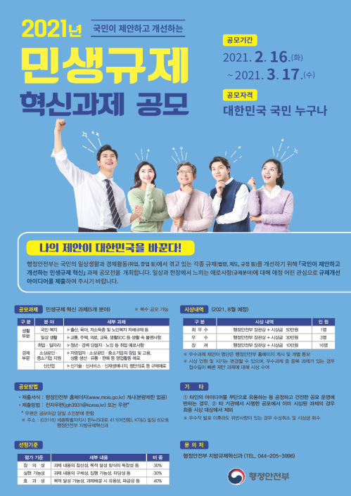 행정안전부는 최근 3년간 민생규제 혁신 과제 공모전을 통해 국민들이 개선 요구한 규제 애로사항에 대하여 부처 간 협업으로 개선하여 왔다.