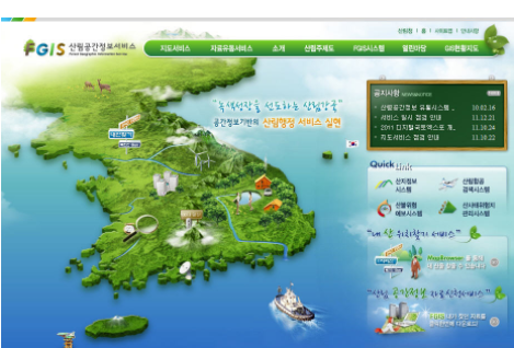 산림공간정보서비스는 산림의 위치정보 및 속성정보를 분석하여 산사태 위험지도, 임상도, 산지 구분도, 임도망도 등 객관적인 산림공간정보를 통합하여 제공하는 시스템이다.