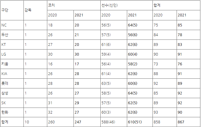 전체 소속선수 등록 숫자는 늘어났지만 코치는 13명이 줄었다. 올해 등록된 코치는 총 247명이며 지난해에는 260명이 등록됐었다. LG가 가장 많은 30명, 키움이 가장 적은 17명의 코치를 등록했다.