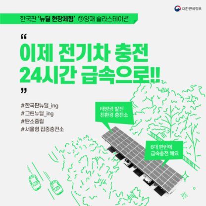 “정부는 그린 뉴딜 분야에 2025년까지 42조원 투자해” 양재 솔라스테이션같은 친환경 충전소가 더욱 많아지도록 최선을 다해 그린 뉴딜 추진하겠습니다!