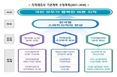 특히, 110년 전 일제에 의해 제작된 종이지적을 디지털 수치좌표 형태의 디지털지적으로 구축하는 지적재조사 사업이 지난해 디지털뉴딜 과제로 선정되어 본격 추진되고, 책임수행기관 제도 도입을 통해 사업추진체계를 전면 개편하는 등 이전 기본계획 수립 당시와 비교해 크게 달라진 사업여건을 이번 수정계획에 충실히 반영하였다는 점에 의미가 있다.