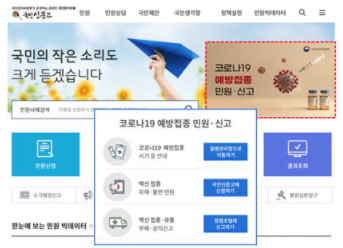 국민권익위원회는 지난달 26일국민신문고 누리집에 코로나19 예방접종 관련 민원신청 및 공익신고 전용 창구를 개설했다. 정부합동민원센터(정부서울청사 별관 1층)를 직접 방문하거나 누리집을 통해서도 민원을 신청하고 상담을 받을 수 있다.