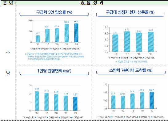 먼저, 국민안전의 최전선에 있는 소방에 13,817명의 인력을 충원한 결과, 소방차량 현장 도착시간은 2016년 7분 23초에서 2020년 7분 8초로 15초 단축되었고, 화재현장에서는 2016년 1,990명에서 2020년 2,312명으로 322명의 인명을 더 구조할 수 있었다.