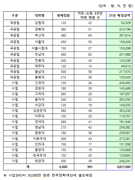 지원방식은 교육부가 법전원(25개교)에 48.87억 원을 지원하고 각 법전원에서 교육부 지원금 및 자체 재원을 활용하여 재학생·신입생 중 기초생활수급자부터 소득 3구간까지의 학생 901명에게 등록금 전액을 지원하게 된다.